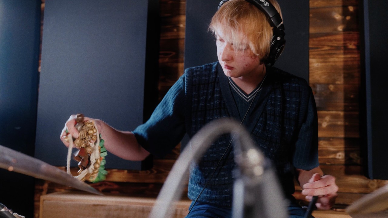Behind him, out of focus, Braeden is crouched low near the kit, crashing cymbals to build atmosphere around what Sawyer is forming. He rises and settles at the drums just before the turn, timing his movement with what he knows is coming.