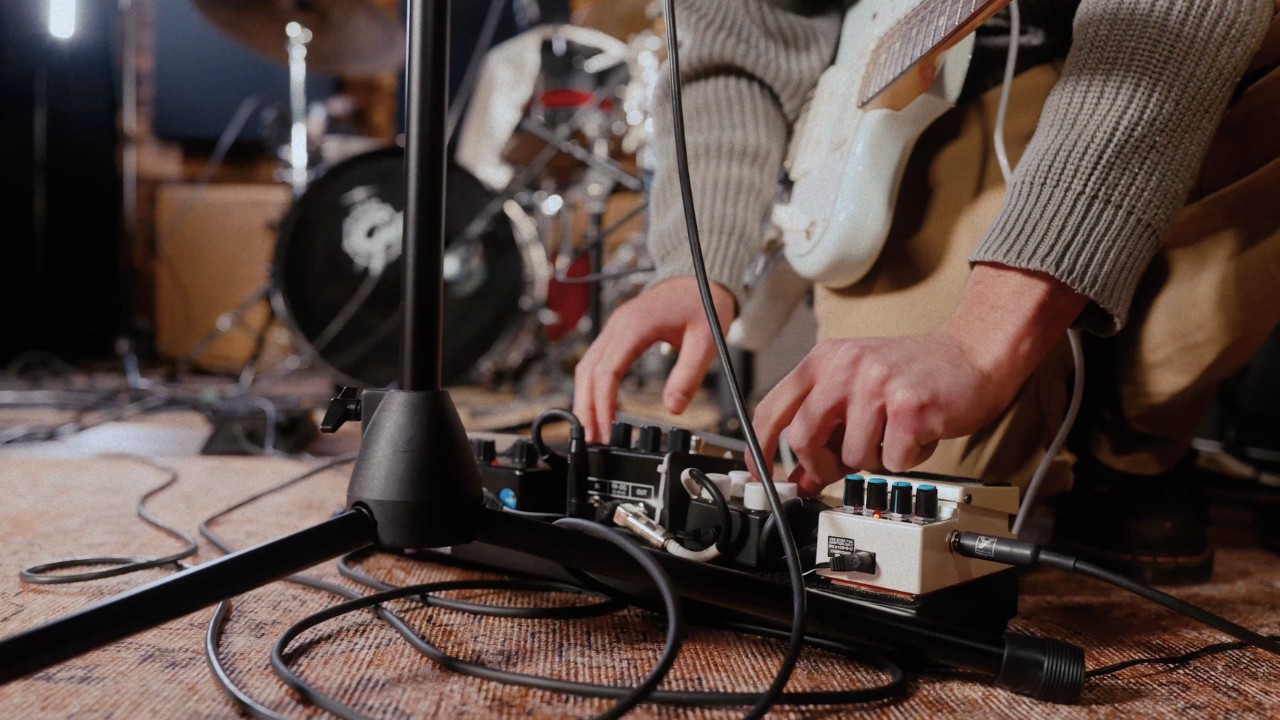 Sawyer is kneeling on the floor, shaping sound through a cluster of guitar pedals. He’s picking the same few notes repeatedly, quick and deliberate, moving between them as he adjusts the tone. Pick. Adjust. Pick again. The character of the sound changes subtly each time.